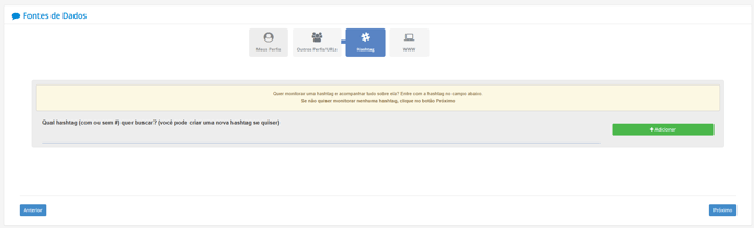 • Hashtag se trata da coleta de publicações que possuem uma determinada hashtag na descrição do conteúdo. Vale ressaltar que, aqui, há um limite de buscas de hashtag apenas para a mídia social Instagram (é possível monitorar 30 hashtags por conta integrada em Meus Perfis):