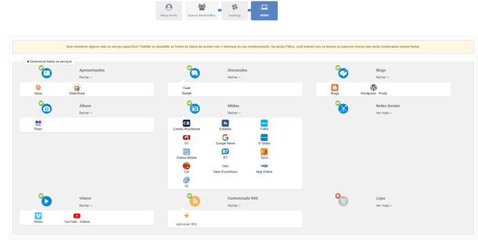 • WWW é o nosso módulo de Mar Aberto. Nele, coletamos conteúdos via palavras-chave de todos esse serviços: