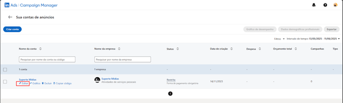 3. Após o login, clique sobre o botão editar da sua conta de anúncios: